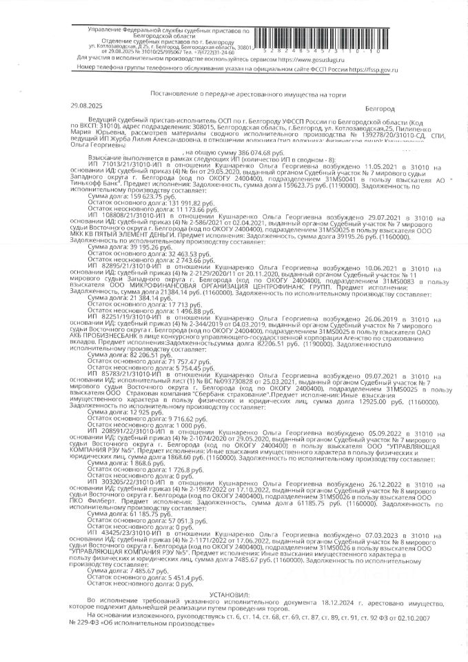 Жилое помещение площадью 33 кв. м, кадастровый номер 31:15:1709001:8155. Имущество обременено: арест, запрещение регистрации. Имущество принадлежит на праве собственности Кушнаренко О.Г. Основание реализации: постановление о передаче арестованного имущества на торги от 29.08.2025 31010/25/995067 ОСП по г. Белгороду