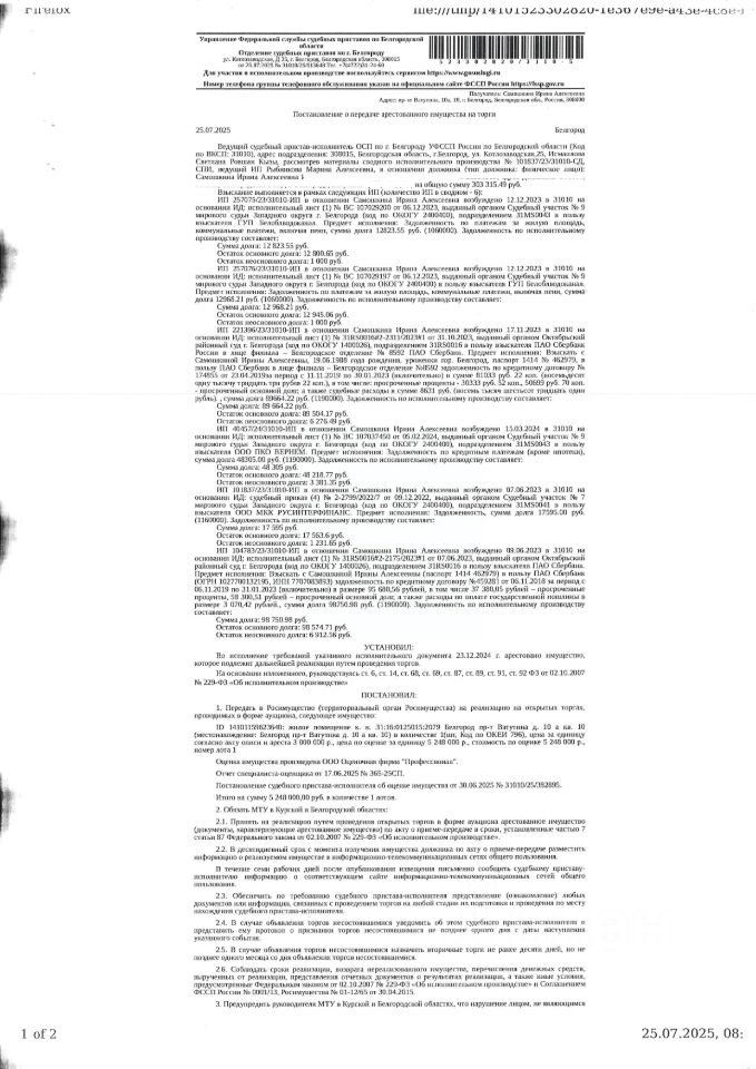 Квартира площадью 47,4 кв. м, кадастровый номер 31:16:0125015:2079. Имущество обременено: арест, запрещение регистрации. Имущество принадлежит на праве собственности Самошкиной И.А. Основание реализации: постановление о передаче арестованного имущества на торги 25.07.2025 31010/25/513648 ОСП по г. Белгороду