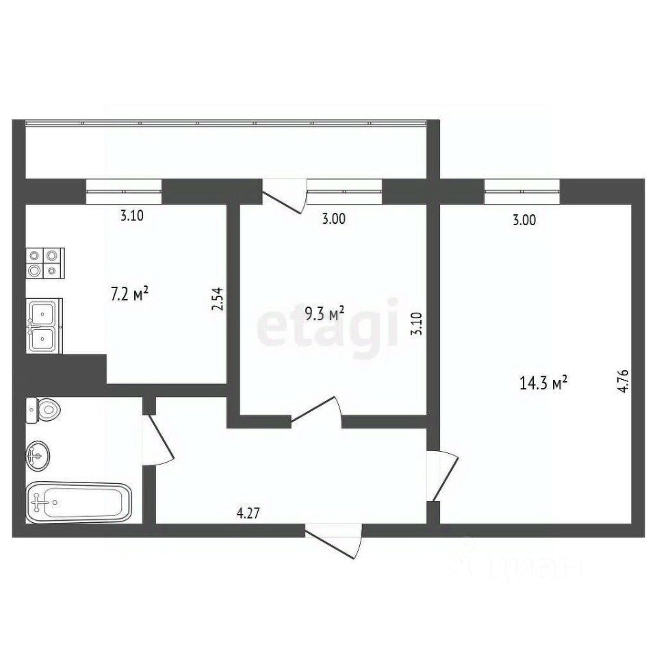 Комнаты изолированные 14.3 м2 и 9.3 м2.