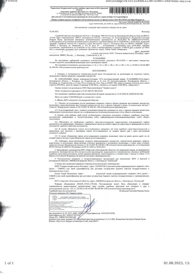 Квартира площадью 47,6 кв. м, кадастровый номер 31:16:0106001:2415. Имущество обременено: арест, запрещение регистрации. Имущество принадлежит на праве собственности Попову Р.В. Основание реализации: постановление о передаче арестованного имущества на торги от 01.08.2025 31010/25/548857 ОСП по г. Белгороду
