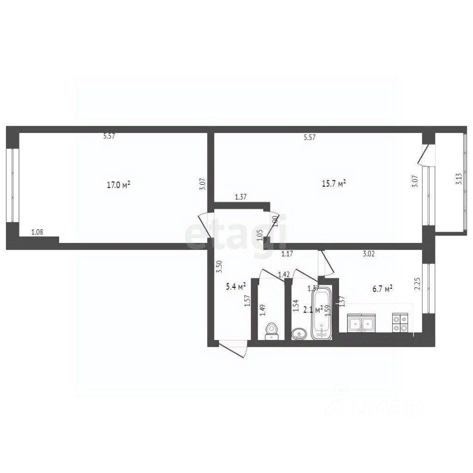 Планировка продумана до мелочей: в спальной комнате просторная гардеробная с двумя шкафами, функциональная кухня с местом для стиральной машины, санузел с инсталляцией и дополнительными системами хранения для бытовых мелочей. В гостиной установлен кондиционер.
