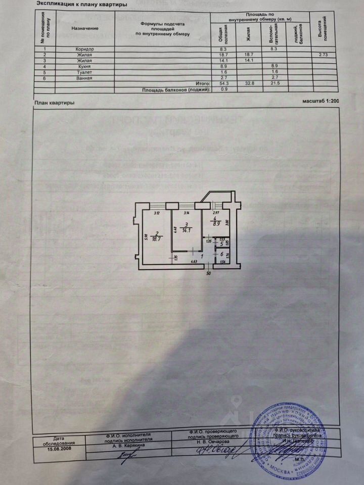 Площадь: общая — 54,3 кв.м., жилая — 32,8 кв.м., кухня — 8,9 кв.м.