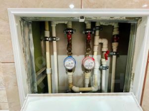 Санузел совмещенный в кафеле до потолка. Установлены счетчики и произведена замена стояков труб горячей и холодной воды.
