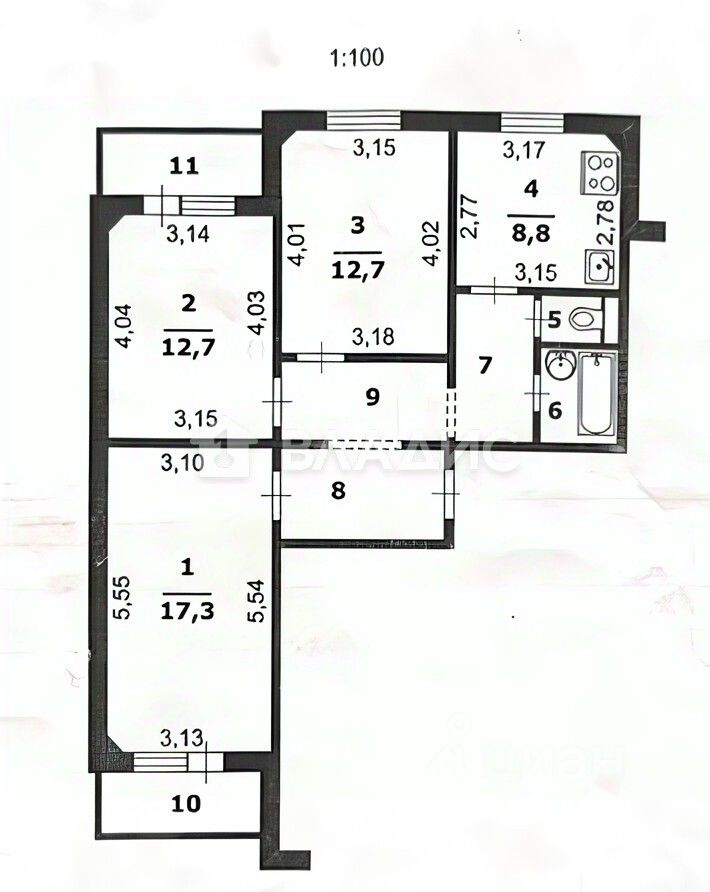 • Просторные комнаты: 17.3 м², 12.7 м² и 12.7 м².