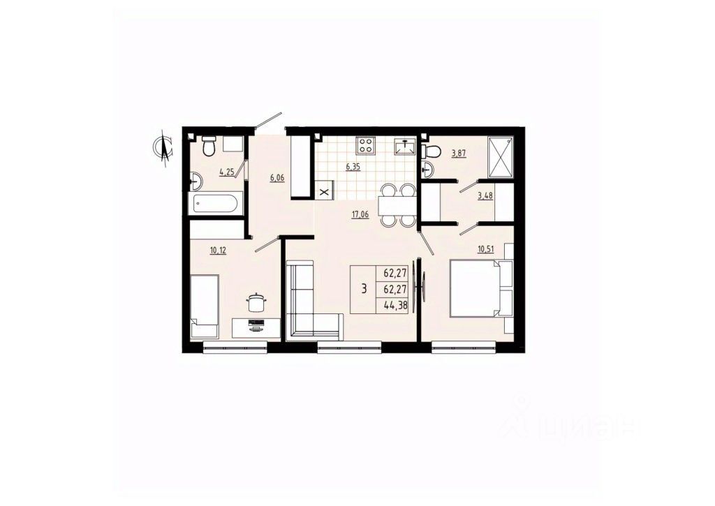 3-комн. квартира, 62,27 м²