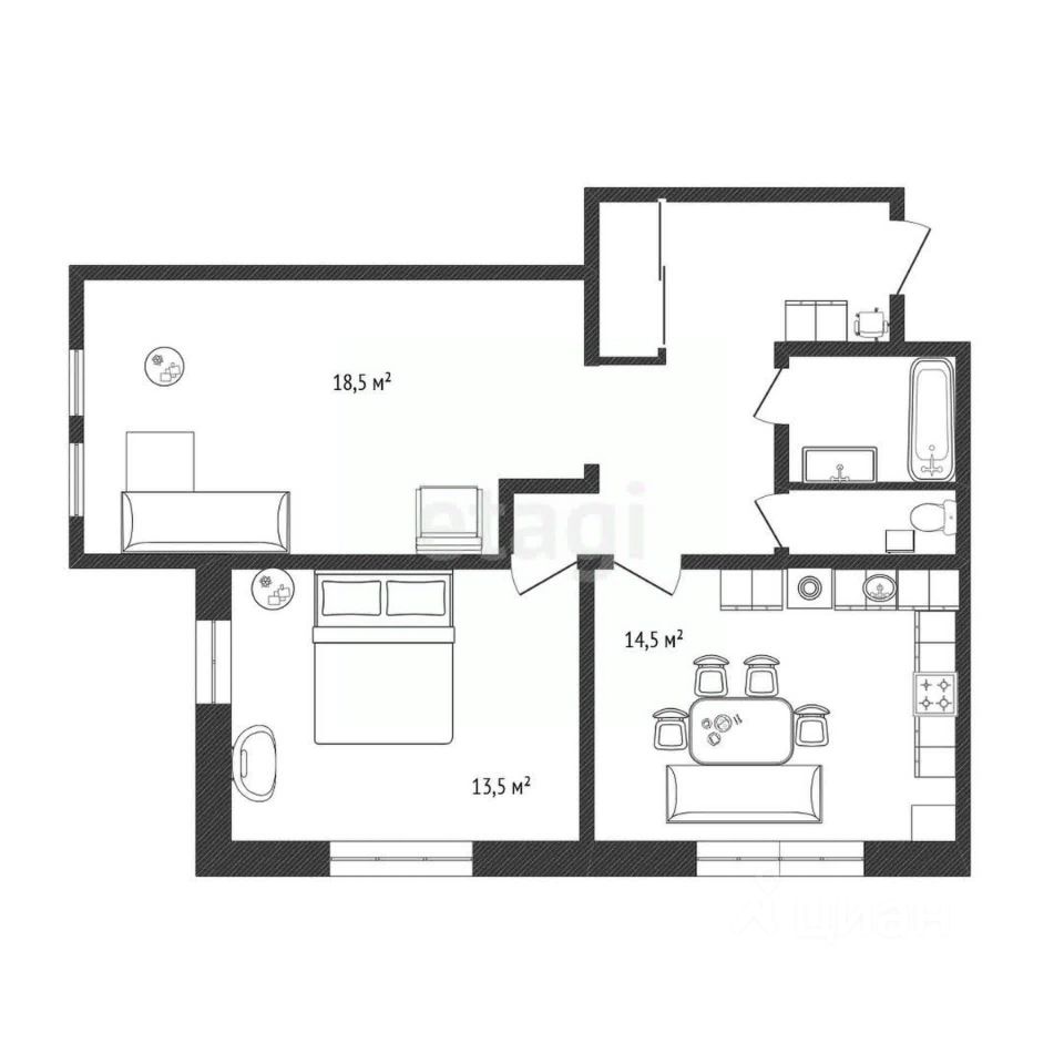Просторная прихожая в которой отлично расположится встроенный шкаф- купе, уютная гостиная 18,5 м2 , светлая спальня 13,5 м2 и большая кухня 14,5 м2 с панорамными окнами в пол .