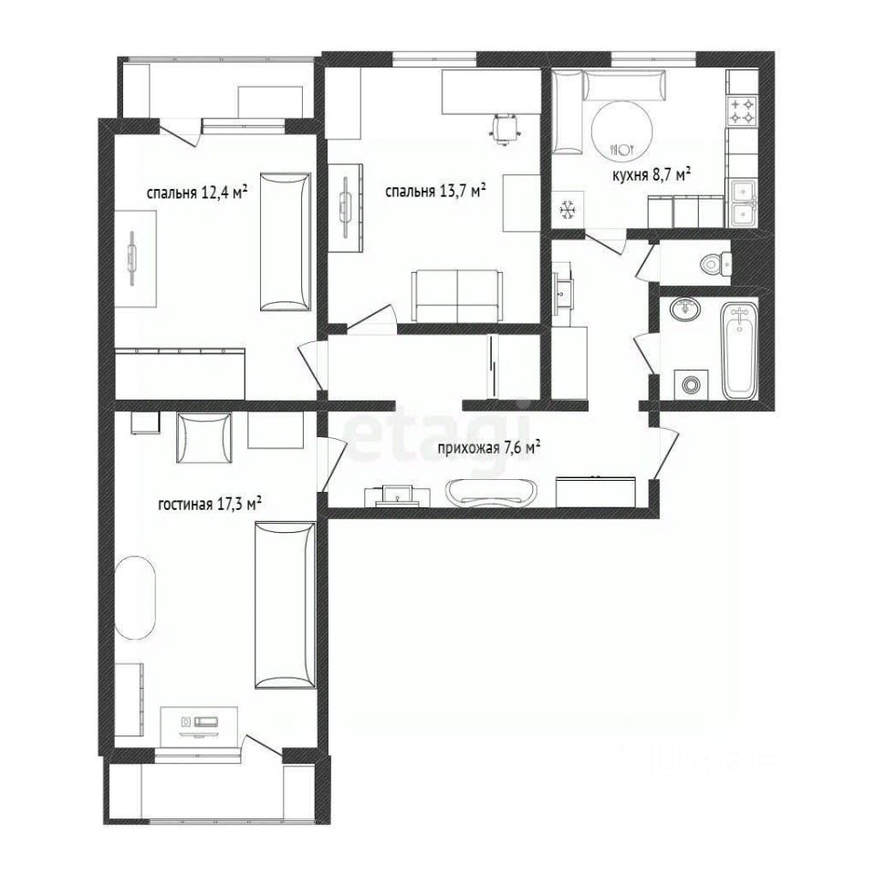 Три просторные изолированные комнаты 17,3 м2, 12,4 и 13,3 м2.