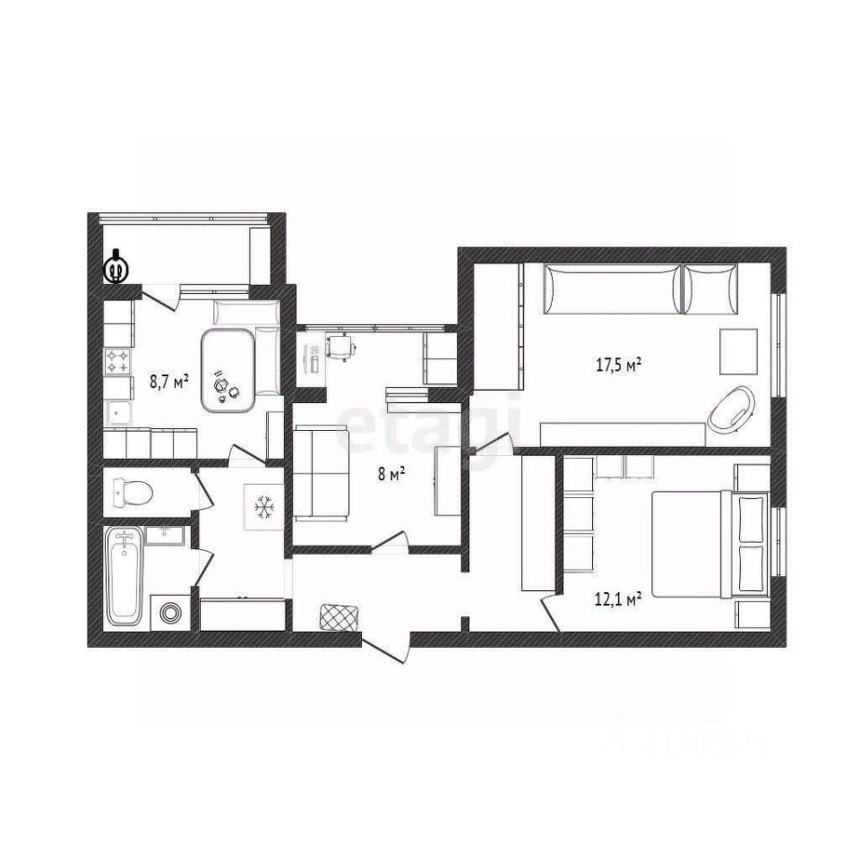 Планировка удобная для жизни семьи . Три изолированные комнаты: 17,5 м2 , 12,1 м2 и 8,1 м2 с присоединенным балконом в котором располагается зона кабинета .
