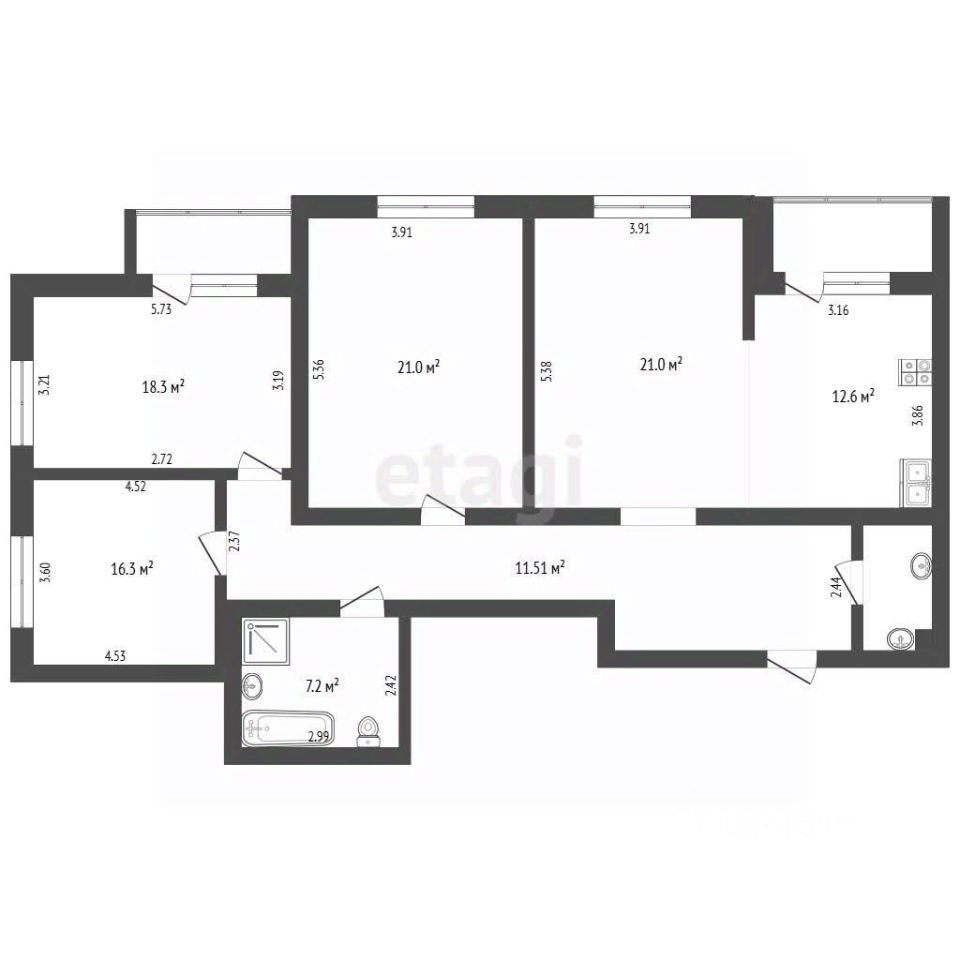 Кухня площадью 13 м² является полноценным центром квартиры. Четыре изолированные комнаты, два санузла.