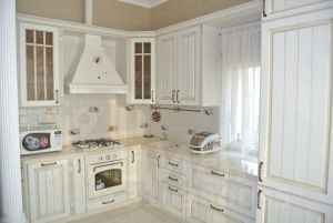 Светлая кухня из массива дерева со встроенной бытовой техникой.