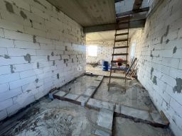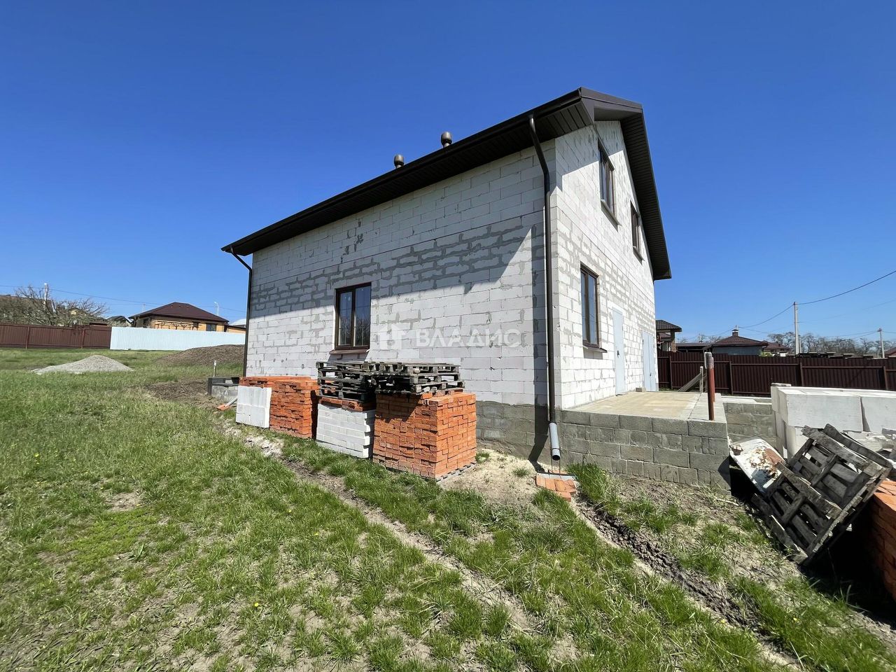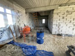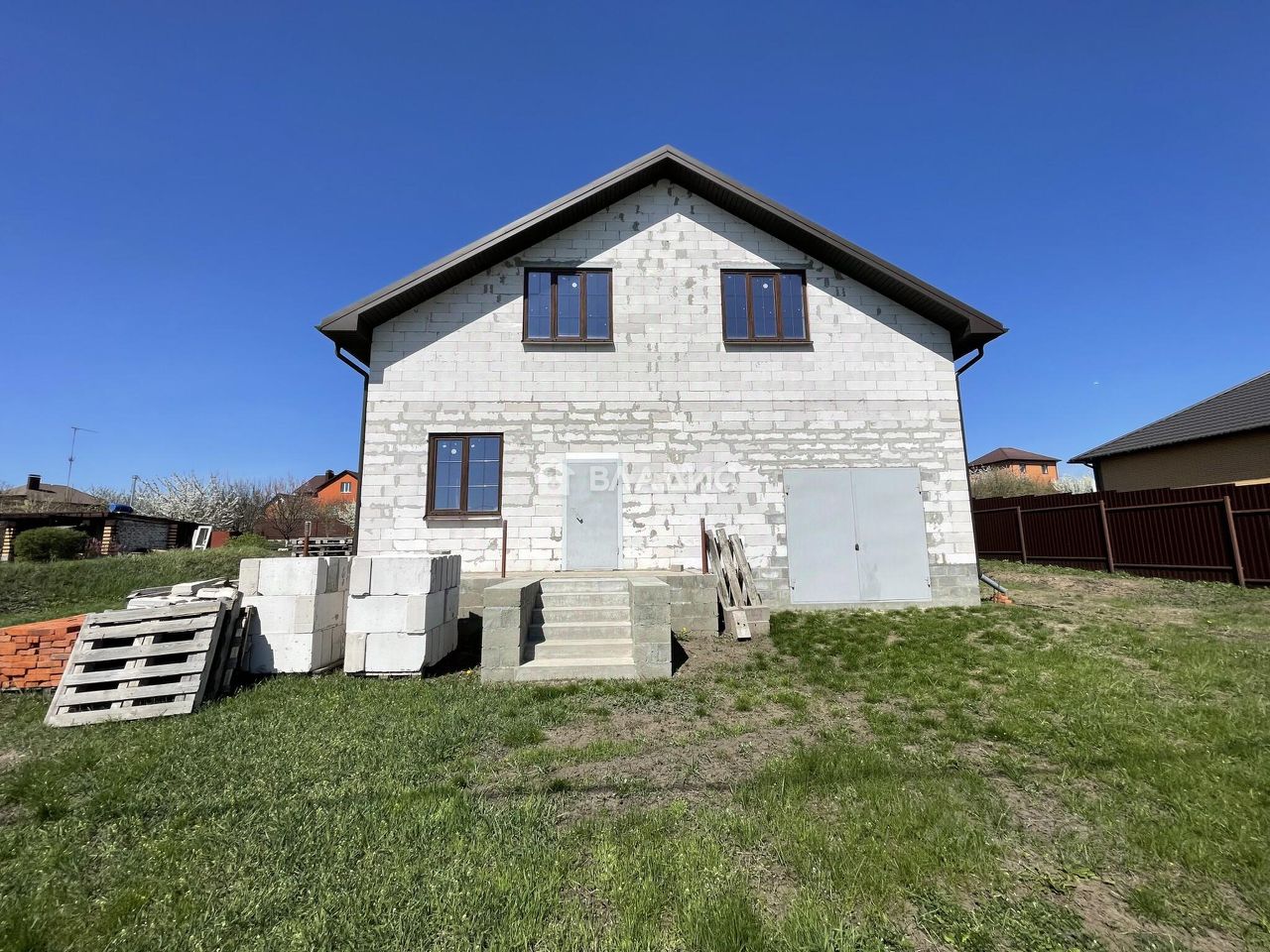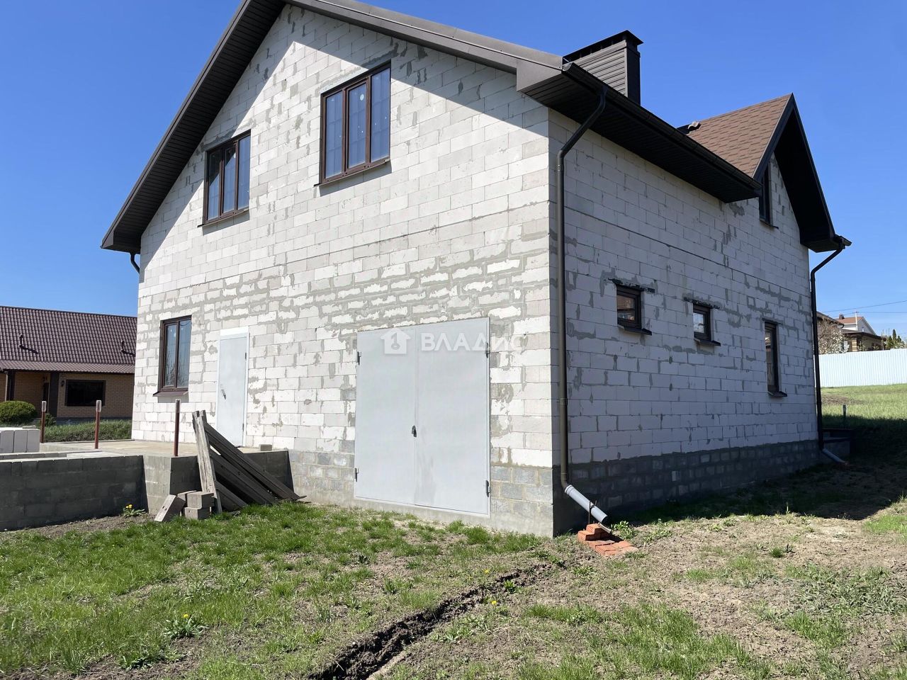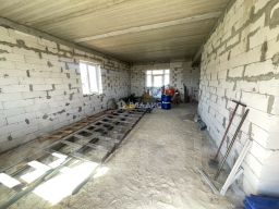 Дом построен из блоков, перекрытия выполнены из железобетонных плит, что гарантирует надёжность и долговечность конструкции. Отопление осуществляется за счёт индивидуального котла, а к участку подведено электричество, водоснабжение и канализация. Участок площадью 15 соток с асфальтированным подъездом предназначен для индивидуального жилищного строительства и уже имеет гараж.
