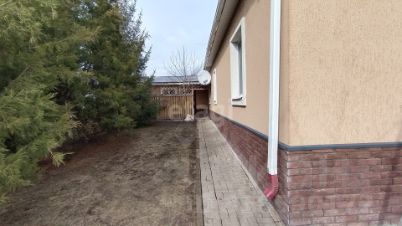 Конструктив дома выполнен из красного кирпича, фасад оштукатурен короедом. Фундамент ленточный 1,7 м. Дом огорожен забором по всему периметру.