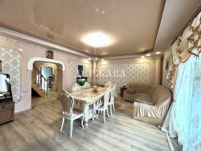 1й этаж - кухня, коридор, гостиная 30 кв.м. с большими окнами в пол, санузел раздельный.