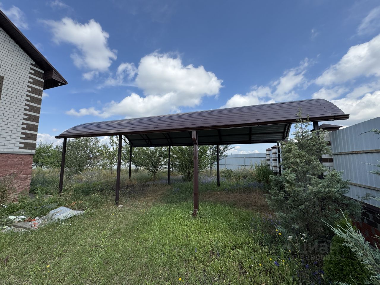 Участок в 16 соток ровный, на заднем дворе высажены несколько сортов винограда, плодовые деревья. Во дворе дома оборудовано парковочное место под навесом.