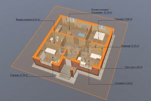 Планировка: 3 раздельные спальные комнаты; Уютная кухня-гостиная с витражным остеклением и выходом на заднюю часть участка; Совмещенный санузел; Просторный холл; Входной тамбур.