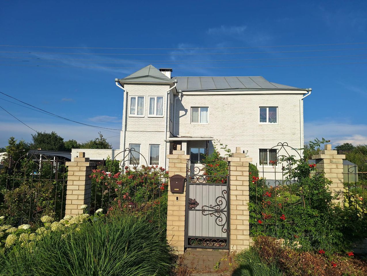 качелями. Перед домом большой