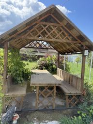На участке есть сарай-кладовая, несколько фруктовых деревьев - активно плодоносят, качели, а также деревянная беседка - останется в подарок и будет служить для отдыха в тени.