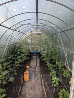 Есть сад с плодовыми деревьями. Теплица.