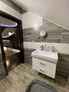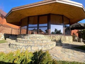 На участке имеется отапливаемый круглогодичный бассейн объемом 50 м3 и глубиной 2 м. Вокруг бассейна сделана крепкая просторная палуба, позволяющая находиться большому количеству близких и друзей, размещать шезлонги, купаться и загорать. Благоустройство из природного камня и морской гальки дает особенное ощущение всего живого вокруг.
