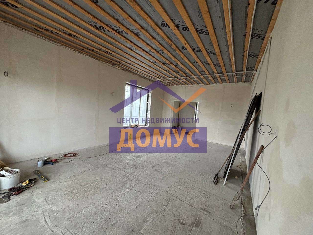 Отделка "предчистовая". Произведена стяжка пола, стены отштукатурены, окна ПВХ. Система "тёплый пол", мягкая кровля подшита и утеплена. Высокие потолки.