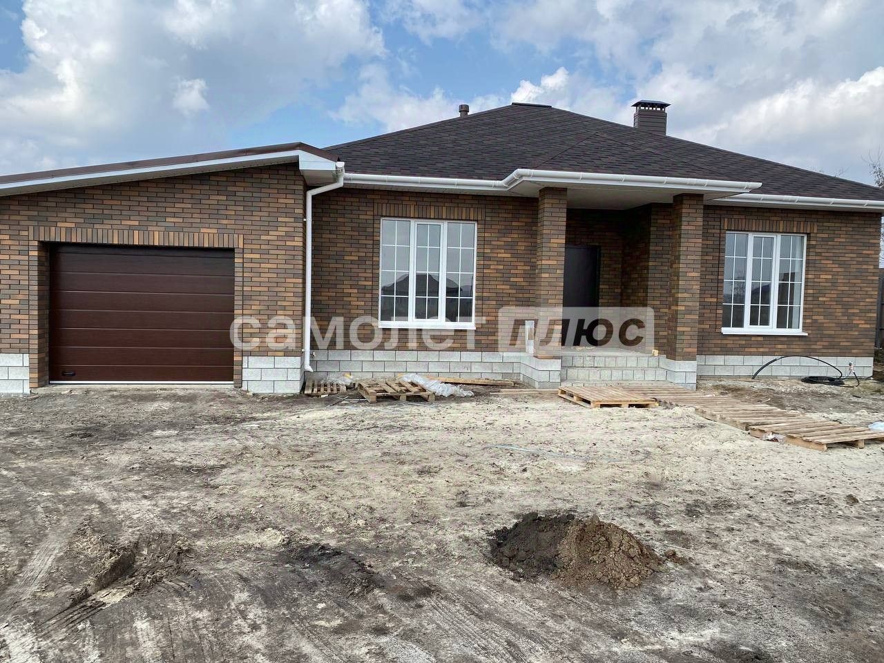 Оштукатурены стены, Стяжка пола чистовая. Стены из Аэробела + облицовочный кирпич. Крыша мягкая кровля. Окна трёхкамерный стеклопакет.