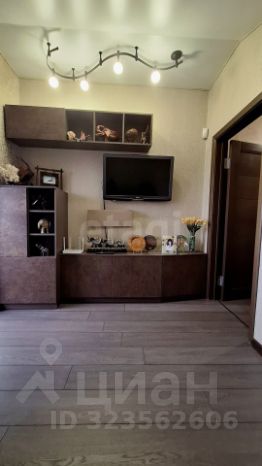 - Гостиную украшает встроенный дизайнерский комод под ТВ, а также белоснежный дизайнерский диван.
