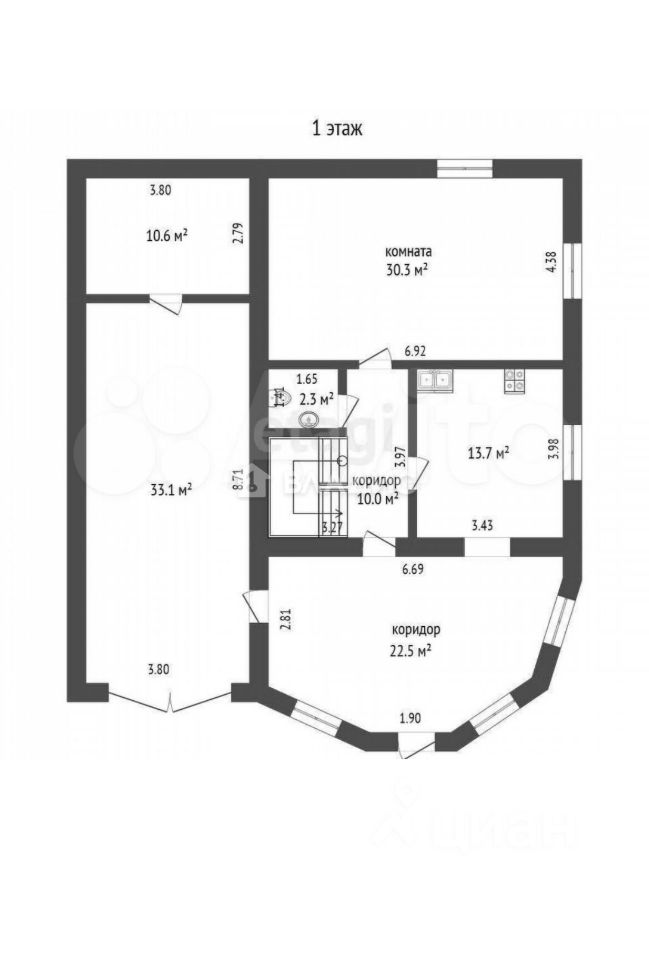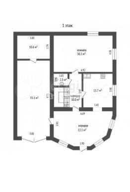 В доме на первом этаже: прихожая, кухня - гостиная с эркером , большая комната .