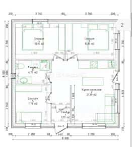 Дом имеет общую площадь 60 кв. м и включает три комнаты: две по 10,2 кв. м и одну 7,8 кв. м. Жилая площадь составляет 28,2 кв. м, а кухня — 21,4 кв. м. Высота потолков — 3 метра, что создаёт дополнительное ощущение простора.