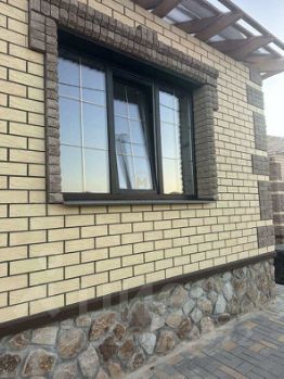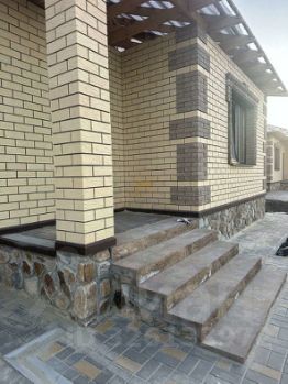Материал: газосиликатный блок (аэробел) с кирпичной облицовкой, кровля - металлочерепица, цоколь выполнен из красивого камня, ступени арбет.