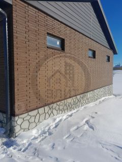 Дом построен из газосиликатных блоков облицован фактурным облицовочным кирпичом, цоколь отделан декоративной штукатуркой под камень.