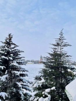 А какой сад! Голубые ели у входа растут словно на открытке.