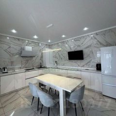 Кухня оборудована современной техникой и стильной мебелью.