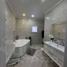 Ванная комната выполнена в современном стиле с качественной сантехникой. Коттедж расположен на участке категории Ижс, что позволяет использовать его для постоянного проживания. На территории также имеется парковочное место.