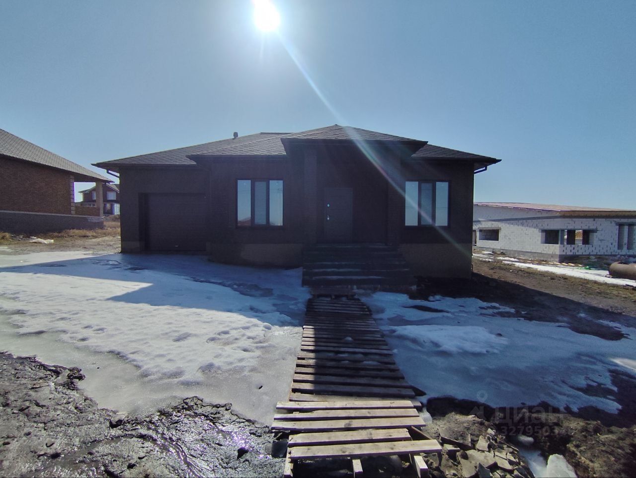 Это одноэтажный дом готовый к чистовой отделке, white box. Просторная территория вокруг дома позволяет свободно планировать благоустройство пространства. Имеется гараж и просторная терраса с выходом из кухне гостиной.