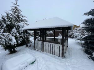 - Во дворе бассейн для рыбок, декоративные деревья и кустарники: можжевельники, туи, ели, сосны, есть мангальная зона и детская площадка.