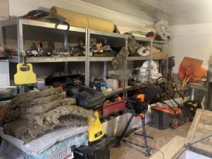 На территории построен летний дом: баня с кухней, мастерская с системой хранения (стеллажи) и подвал.