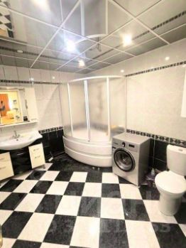 Потолок комбинированный: натяжной и армстронг чёрного зеркального цвета (выглядит очень стильно).