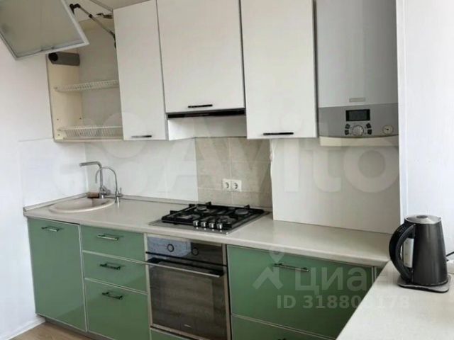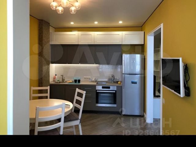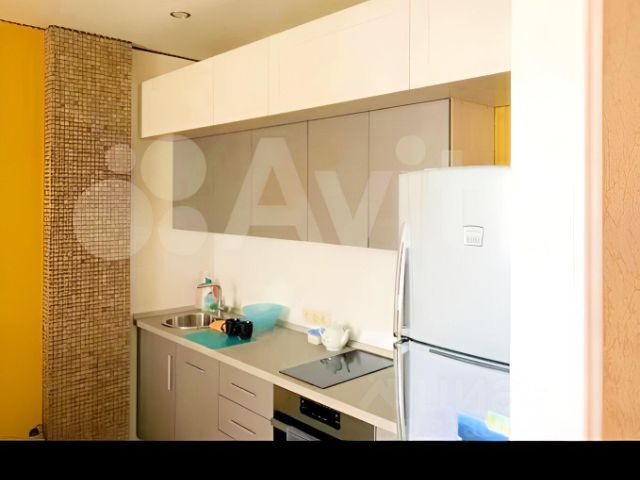 Светлая небольшая кухня, в современном ремонте, создаёт уютную атмосферу. Есть все необходимое для приготовления пищи: плита, холодильник, микроволновка, чайник, кастрюли, столовые приборы.